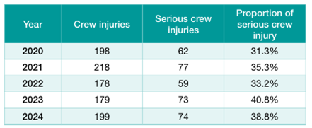 A total of 74 incidents were reported in 2024, with serious crew injuries accounting for 38.7% of all reported injuries with a slight increase since 2022.