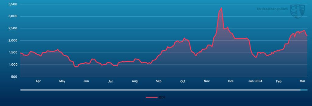 THE BALTIC Dry Index declined each day this past week, landing at 2196 on Friday 22 March.