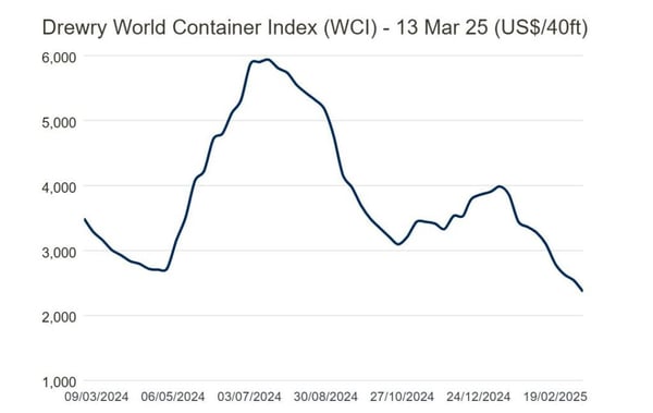 The Drewry WCI composite index decreased 7% to $2,368 per 40ft container,